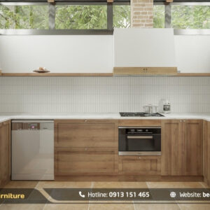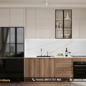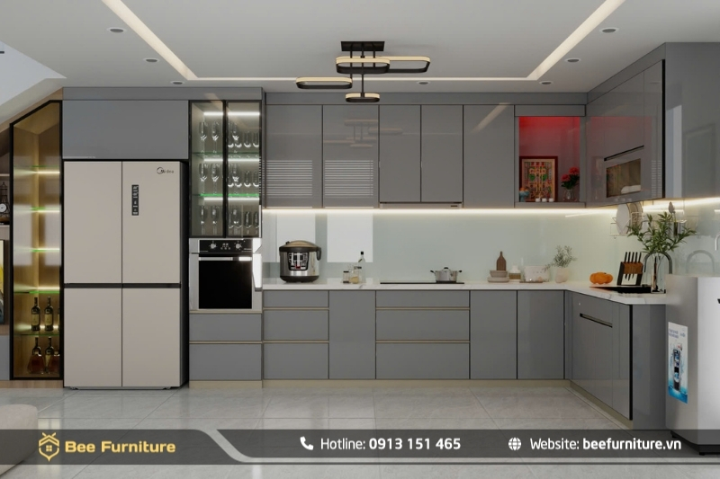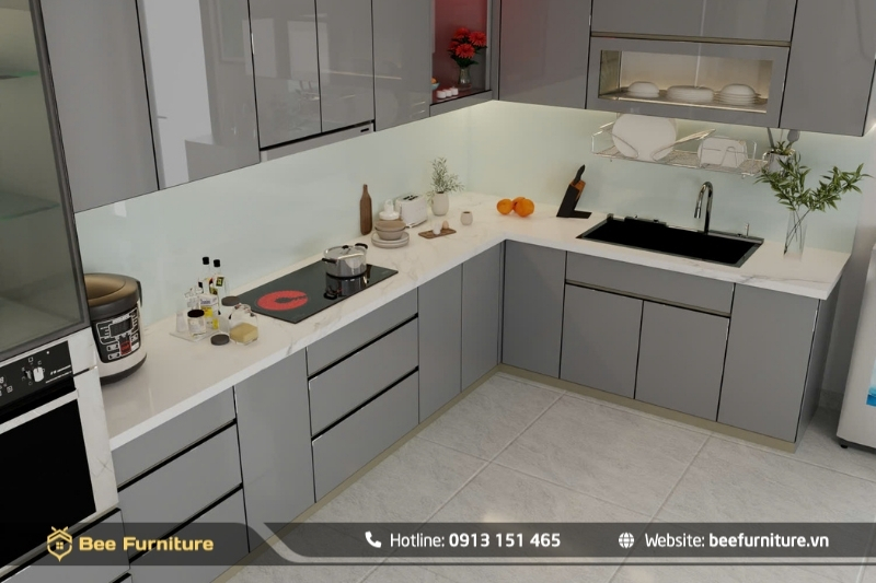Tủ bếp sử dụng chất liệu nhôm cánh kính hoặc inox cao cấp, có độ bền cao, chịu lực và chống ẩm tốt. Khu vực nấu nướng được trang bị bếp từ hiện đại, máy hút mùi công suất lớn, mang đến một không gian bếp lý tưởng để chế biến những bữa ăn ngon, tiện nghi và dễ dàng vệ sinh sau sử dụng.