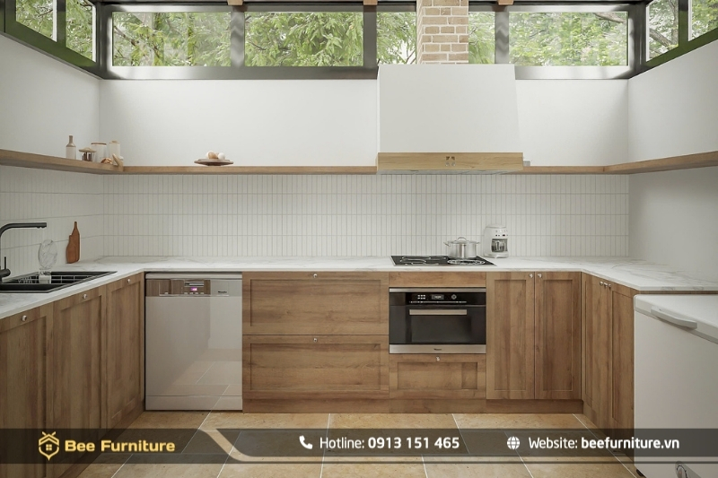 Phòng bếp được thiết kế đầy đủ công năng, đáp ứng nhu cầu nấu nướng của gia chủ, đặc biệt là phái nữ – những người yêu thích việc chăm chút cho bữa ăn gia đình. Hệ thống tủ và kệ bếp được bố trí khoa học, giúp tối ưu diện tích và giữ cho không gian luôn gọn gàng, ngăn nắp.