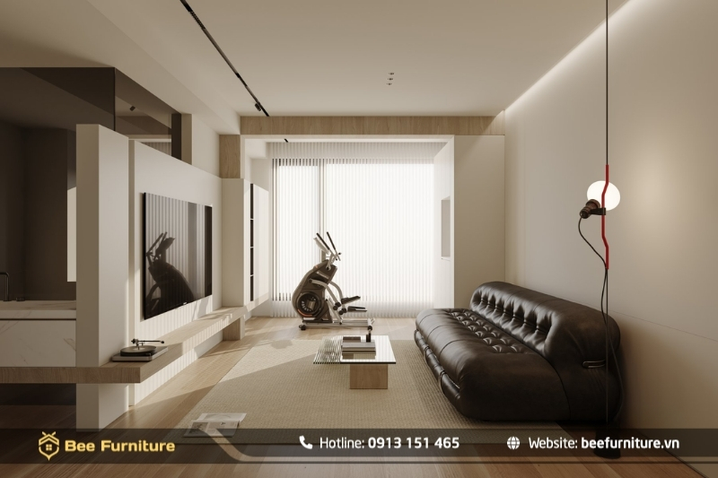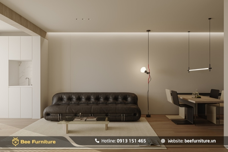 Phòng khách được thi công chỉn chu với điểm nhấn là bộ sofa bọc da cao cấp đến từ xưởng sản xuất nội thất Bee Furniture, thường sử dụng những gam màu trung tính thanh lịch, dễ kết hợp với nhiều phong cách thiết kế và có thể thay đổi theo sở thích gia chủ. Thiết kế không sử dụng các vách ngăn giữa phòng khách và khu vực sinh hoạt chung, giúp mở rộng tầm nhìn và mang lại cảm giác thông thoáng cho toàn bộ căn hộ. Dù có diện tích khiêm tốn, không gian vẫn được bố trí đầy đủ tiện nghi và thẩm mỹ.