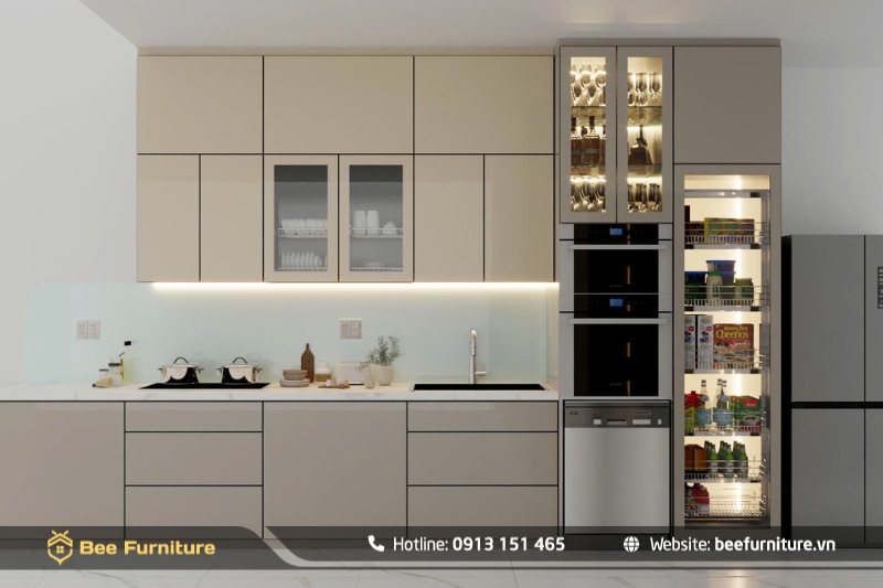 Ngoài ra, thiết kế này thường đi kèm hệ thống tủ bếp trên và dưới với nhiều khoang chứa đồ, ngăn kéo và khu vực tích hợp thiết bị nhà bếp như lò nướng, lò vi sóng, máy rửa chén… Nhờ vậy, không gian lưu trữ được tối đa hóa, mọi vật dụng đều có vị trí riêng, giữ cho gian bếp luôn ngăn nắp, sạch sẽ và dễ dàng sử dụng hàng ngày.