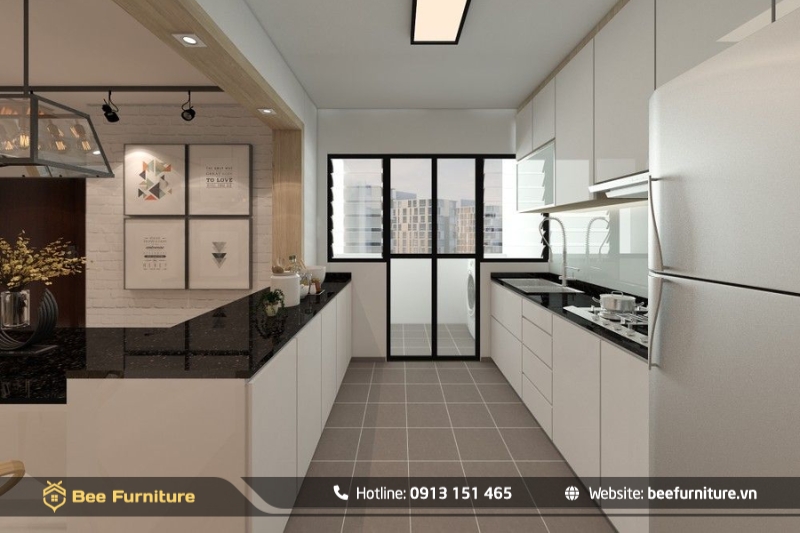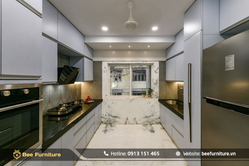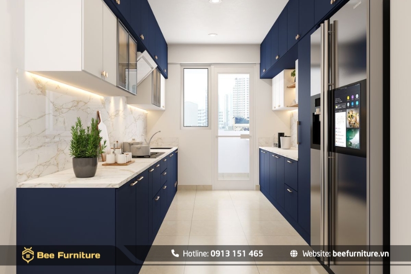 Tủ bếp song song (còn gọi là bếp galley) là kiểu thiết kế gồm hai dãy quầy bếp chạy song song, tạo thành một hành lang làm việc ở giữa. Vớ cấu itrúc đối xứng giúp bố trí các khu vực chức công năng khoa học, thao tác dễ dàng và tiết kiệm thời gian trong quá trình nấu nướng.
