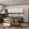 Thiết kế bếp có quầy bar tiện dụng thường được bố trí cao hơn mặt bàn bếp khoảng 30cm, tạo nên sự tách biệt nhẹ nhàng về công năng nhưng vẫn đảm bảo tính kết nối trong không gian. Một số thiết kế hiện đại còn tích hợp thêm tủ rượu, giá treo ly hoặc hộc chứa đồ, giúp tiết kiệm diện tích và nâng cao công năng sử dụng.