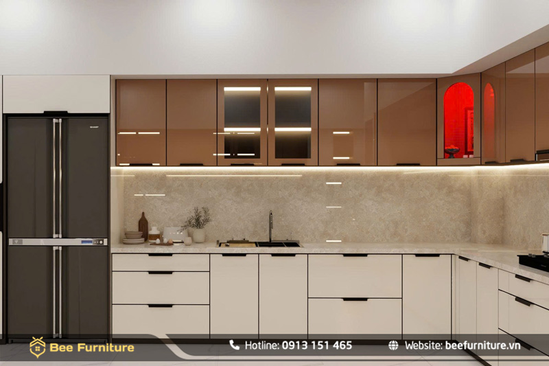 Khu vực bếp được Bee Furniture thiết kế với hệ tủ bếp nhôm cánh kính sang trọng, chống nước, chống mối mọt ẩm mốc và dễ dàng vệ sinh trong quá trình sử dụng