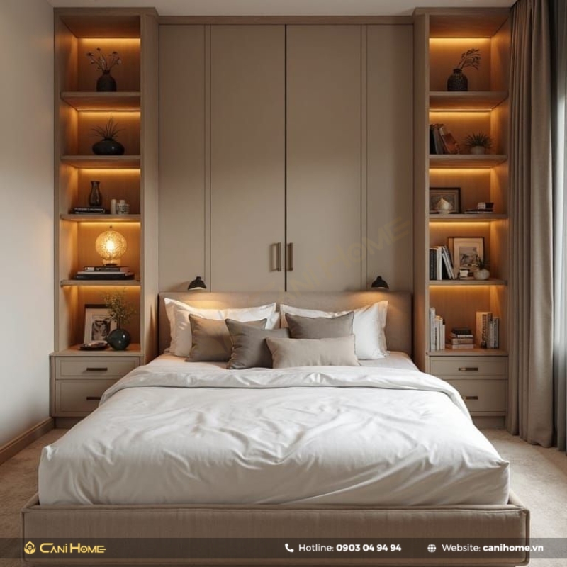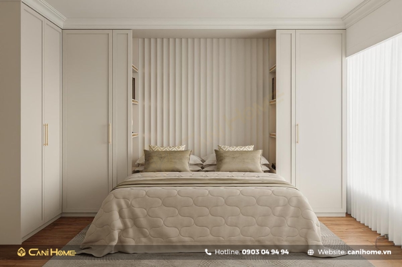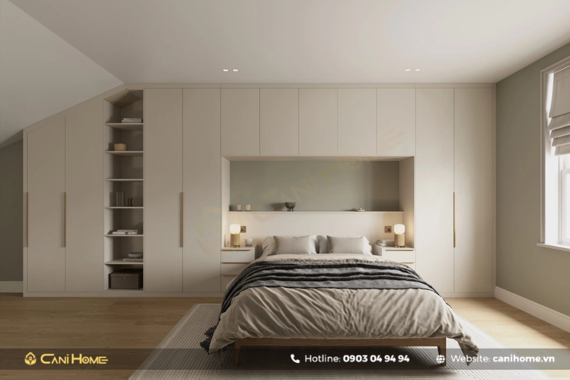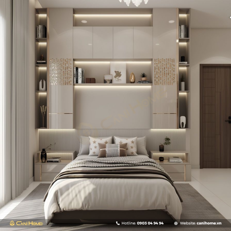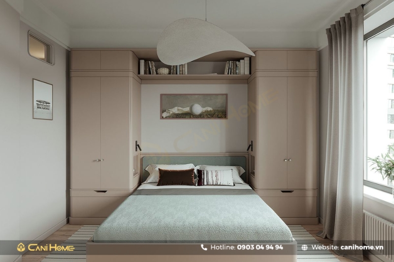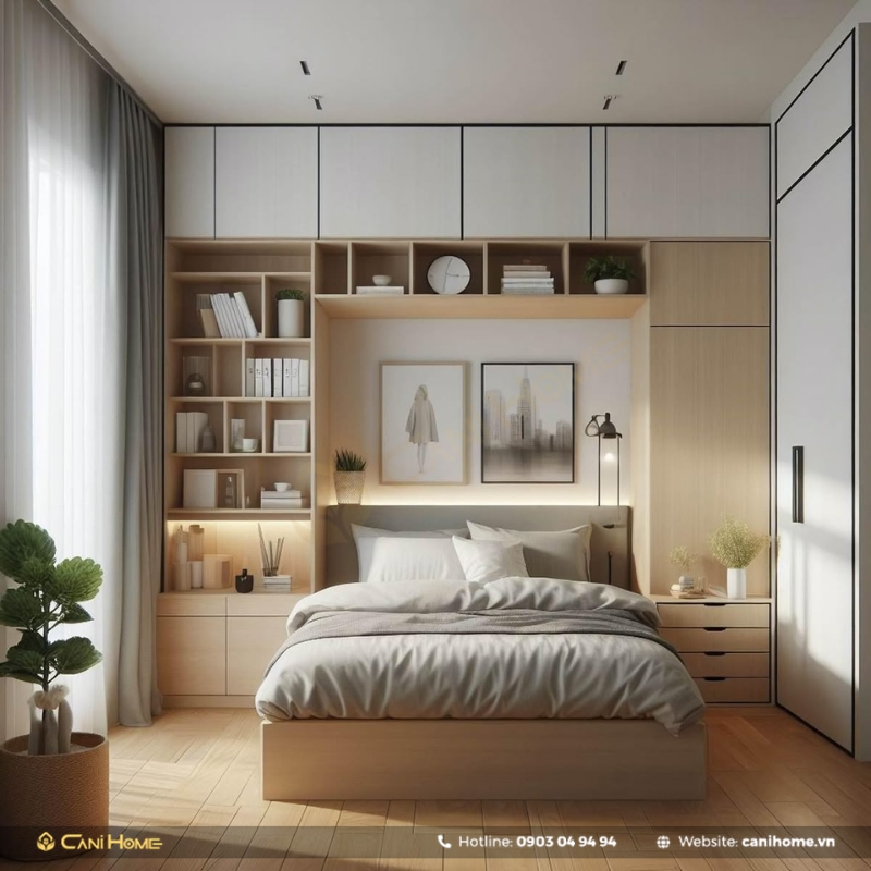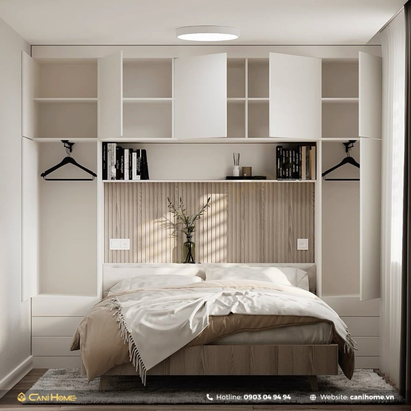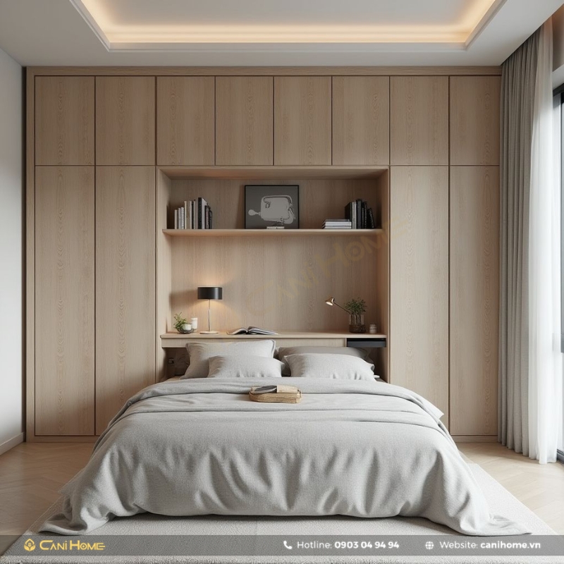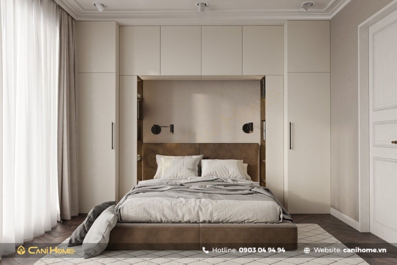 Tích hợp đa chức năng trong một thiết kế: Giường được bố trí liền khối với hệ tủ quần áo, ngăn kéo hoặc kệ lưu trữ, mang lại sự tiện ích và tối ưu không gian.