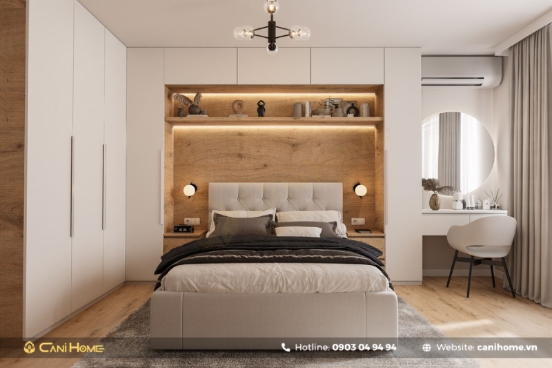 Tủ được bố trí âm vào vách nhằm hạn chế chiếm diện tích sử dụng. Nhờ đó không gian thông thoáng hơn, phù hợp với căn hộ chung cư. Kiểu tủ âm tường giúp căn phòng gọn gàng và có chiều sâu thẩm mỹ.