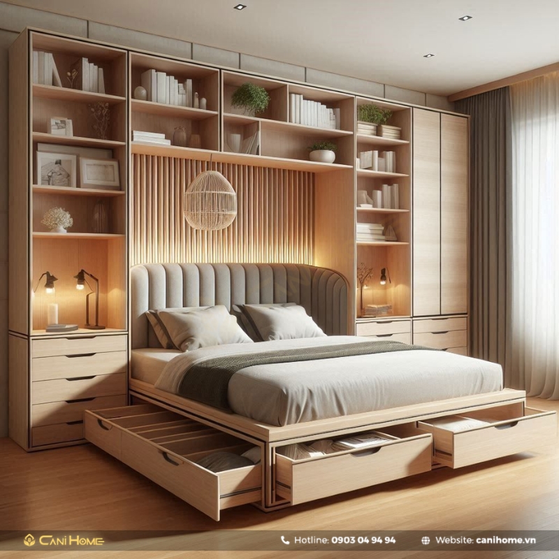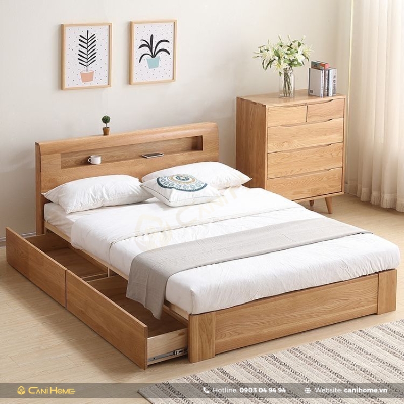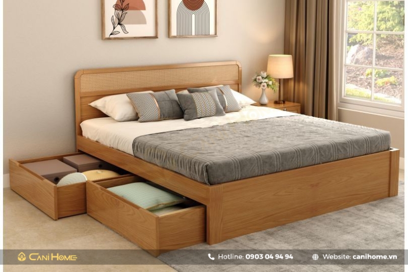 Thiết kế này tích hợp các hộc kéo dưới giường để chứa quần áo, đồ dùng cá nhân, ga gối hoặc phụ kiện. Đây là giải pháp lý tưởng cho những phòng ngủ có diện tích khiêm tốn nhưng cần nhiều không gian lưu trữ.