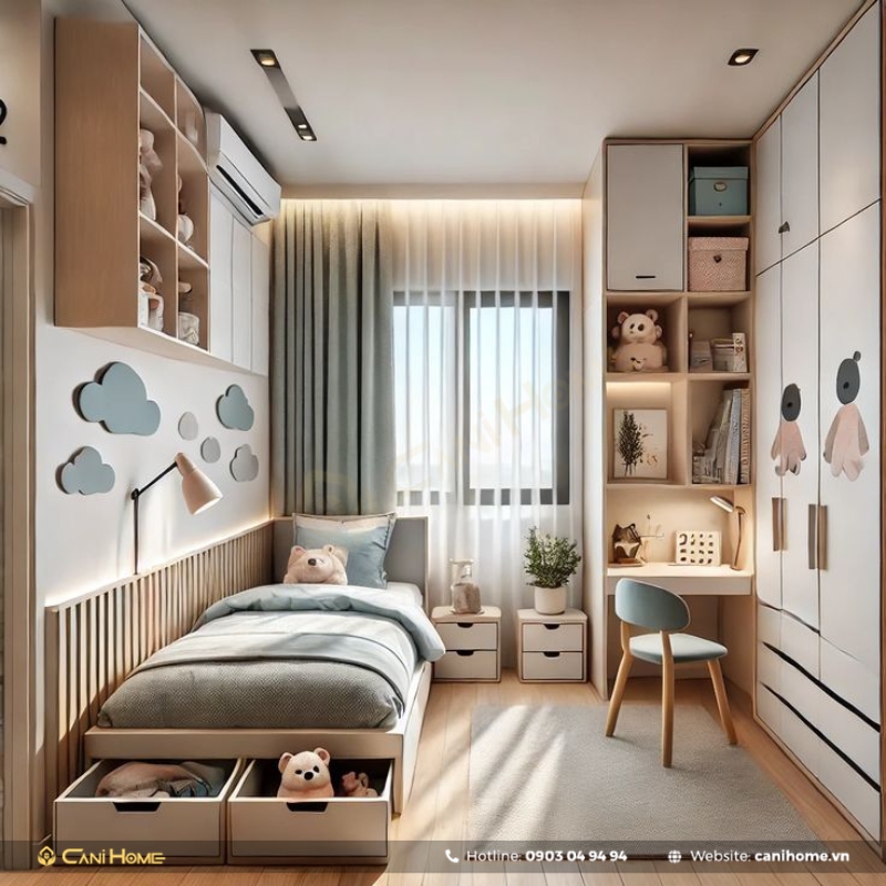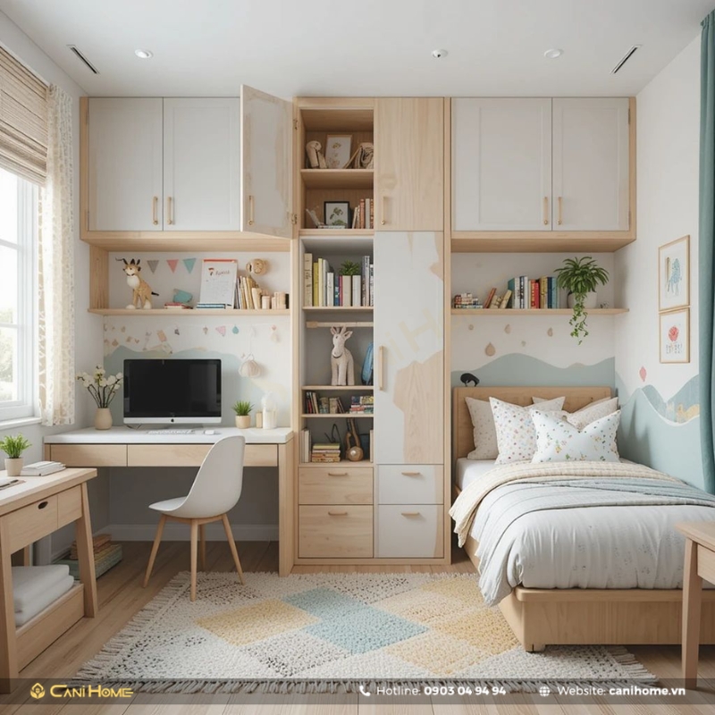 Tiết kiệm không gian: Thiết kế kết tích hợp nhiều công năng trong 1 sản phẩm, phù hợp với những căn hộ diện tích nhỏ, phòng ngủ chung cư hoặc phòng ngủ cho trẻ.