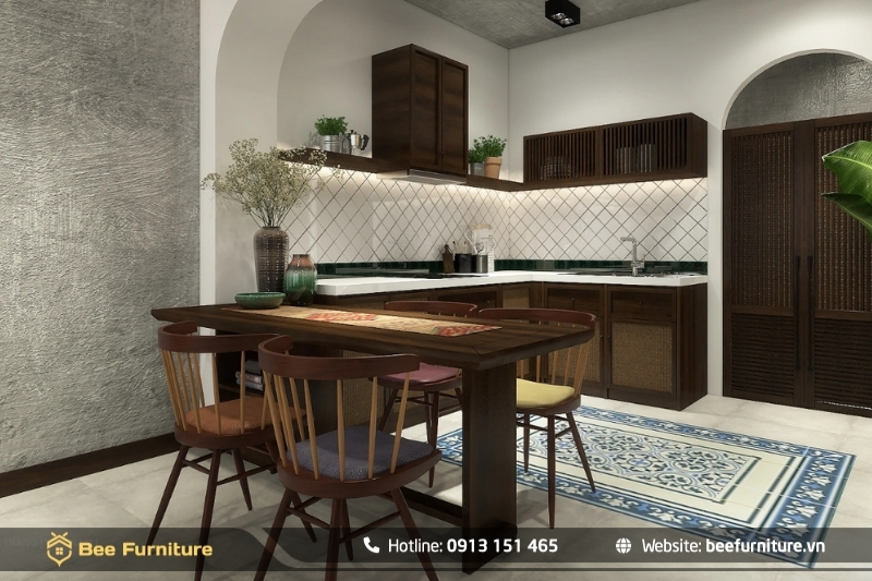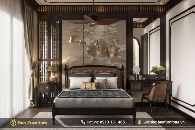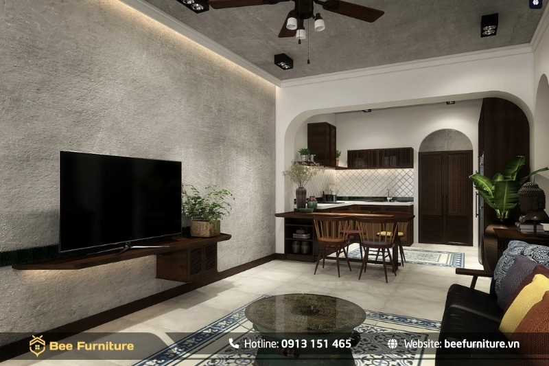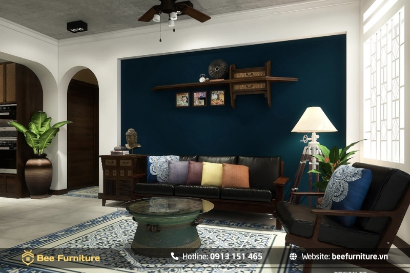 Phong cách Indochine thường sử dụng các gam trầm ấm, trung tính như nâu, vàng, trắng kem, đen… kết hợp hài hòa với điểm nhấn màu xanh ngọc, vàng đất hoặc đỏ đô. Điểm nhấn của không gian sẽ là những hoa văn cầu kỳ như hoa sen, họa tiết gạch bông tạo dấu ấn đậm chất Á Đông.