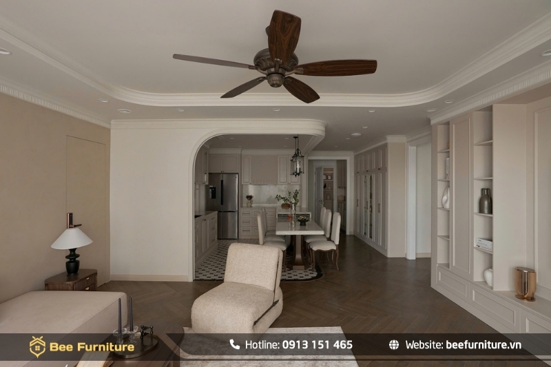 Căn hộ 2 phòng ngủ theo phong cách Tân cổ điển (Neo Classical) là sự kết hợp hài hòa giữa vẻ đẹp sang trọng cổ điển và sự tiện nghi, gọn gàng của hiện đại. Phong cách này thường sử dụng các đường nét kiến trúc cân đối, đối xứng, tạo điểm nhấn ở các chi tiết phào chỉ, hoa văn mang đến sự mềm mại và thanh lịch.