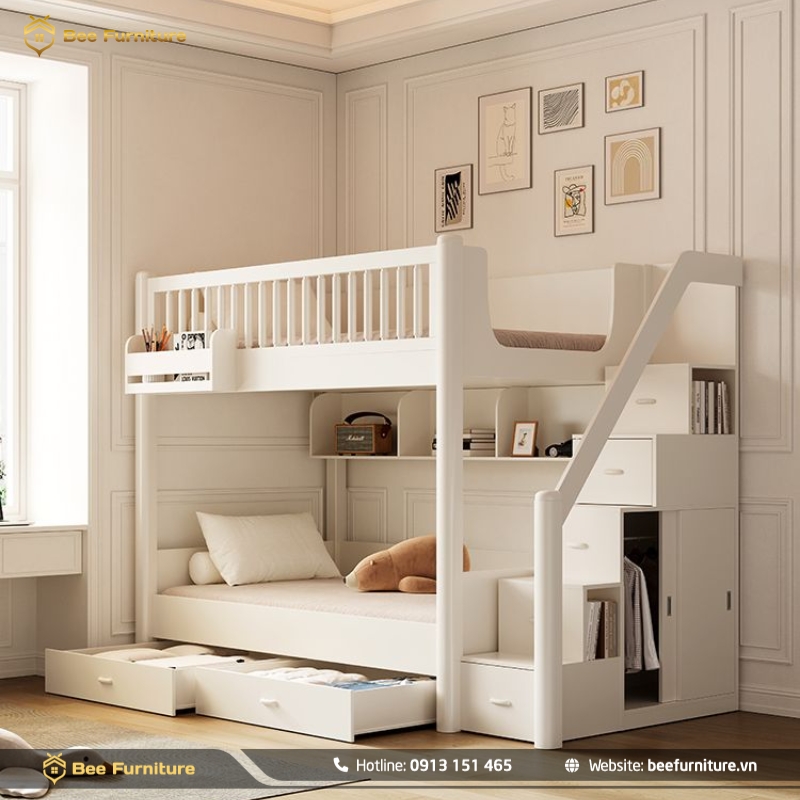 - Đa năng và tiện lợi: Nhiều mẫu được tích hợp bàn học, tủ quần áo hay ngăn chứa đồ, mang đến không gian đầy đủ chức năng và tối ưu chi phí cho gia đình.