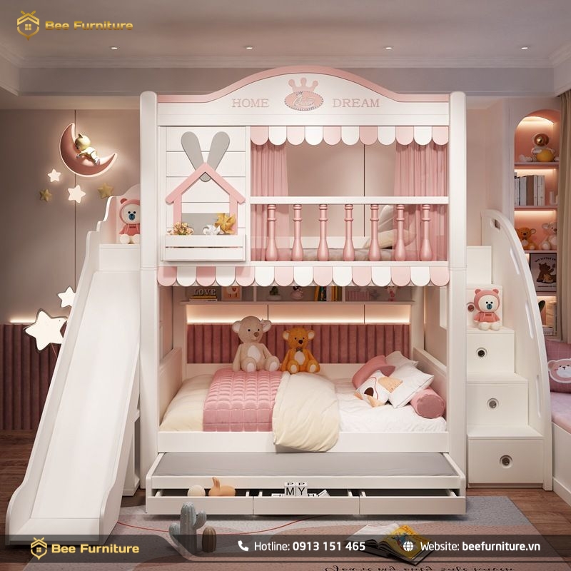 Giường tầng với tông màu nhẹ nhàng, nữ tính như hồng pastel, kem, trắng hoặc họa tiết công chúa, hoa lá; kết hợp lan can uốn cong, vật liệu mềm mại, thích hợp với sở thích bé gái.