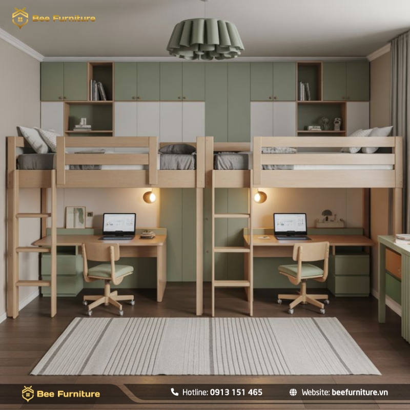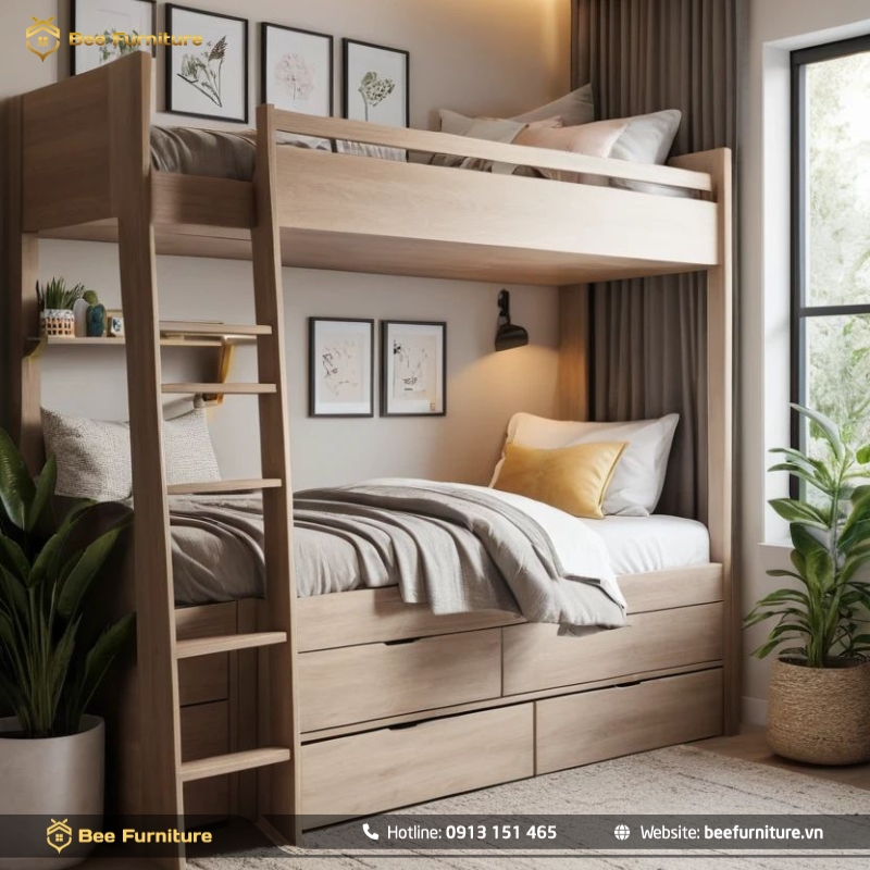 Phù hợp với: Gia đình sống ở căn hộ nhỏ, phòng ngủ hẹp, muốn tiết kiệm không gian mà vẫn cần 2 giường.