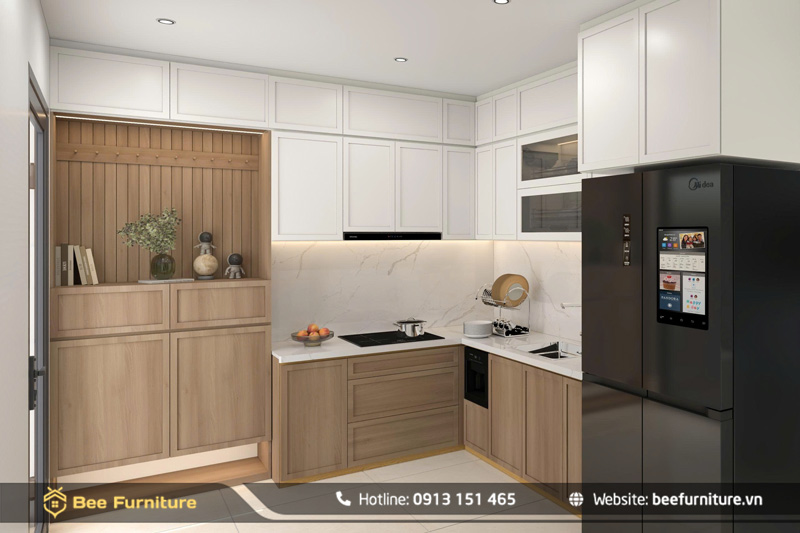 Tủ bếp chữ L gỗ công nghiệp là lựa chọn lý tưởng cho những gia đình yêu thích phong cách hiện đại, tiện nghi với mức chi phí hợp lý. Bee Furniture sử dụng chất liệu gỗ công nghiệp lõi xanh chống ẩm bề mặt Melamine, đa dạng về màu sắc, vân gỗ, dễ dàng phối hợp với nhiều phong cách nội thất khác nhau, từ tối giản đến sang trọng.
