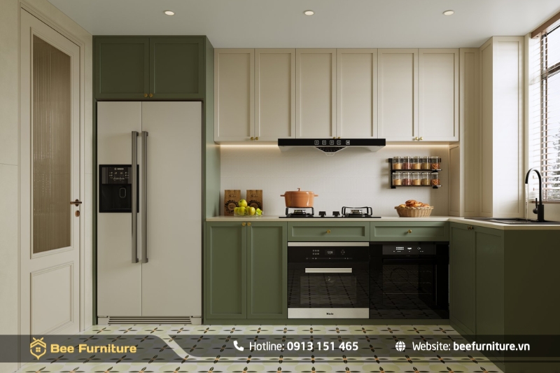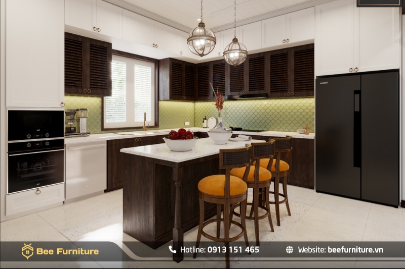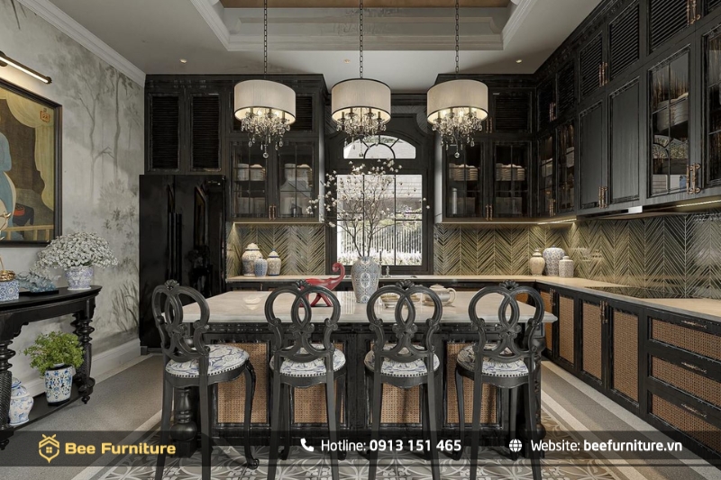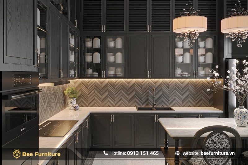 Tủ bếp chữ L theo phong cách Indochine (Đông Dương) là lựa chọn lý tưởng cho những gia chủ yêu thích sự tinh tế của vẻ đẹp cổ điển Á Đông.Thiết kế này thường sử dụng gam màu trung tính như trắng, kem, đen hoặc nâu gỗ trầm, kết hợp cùng chi tiết họa tiết truyền thống châu Á hoặc hoa văn uốn lượn nhẹ nhàng.