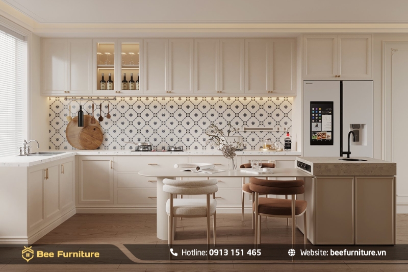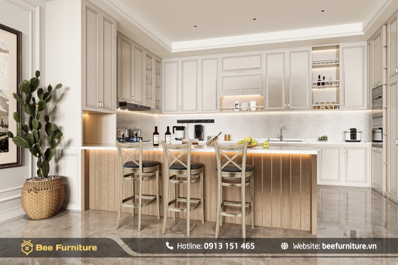 Mẫu tủ bếp đẹp hình chữ L theo phong cách tân cổ điển