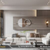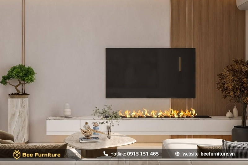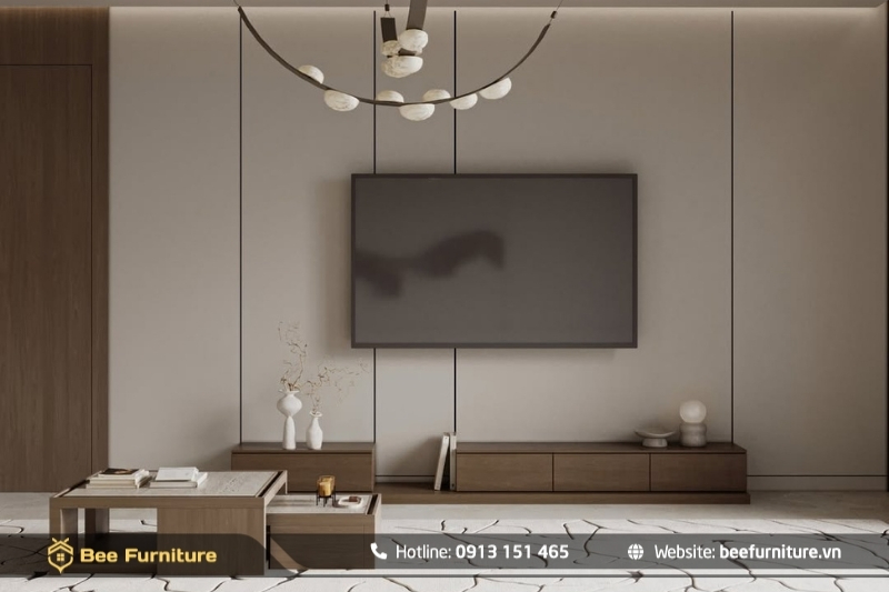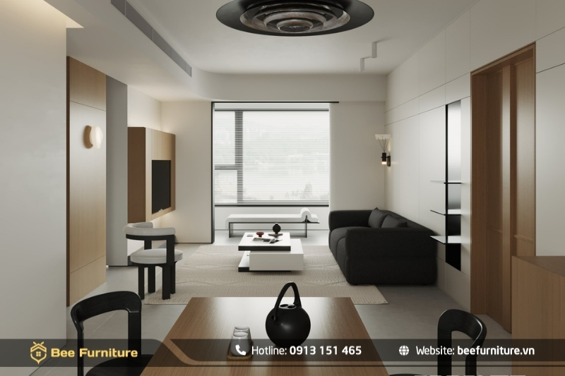 Thiết kế tối giản nhưng không đơn điệu, từng chi tiết nội thất đều được trau chuốt kỹ lưỡng. Bàn trà, kệ tivi và đèn trần được lựa chọn theo phong cách đồng nhất, tôn lên sự thống nhất trong bố cục không gian. Ánh sáng âm trần dịu nhẹ giúp tăng chiều sâu và tạo cảm giác thư giãn tự nhiên cho cả căn phòng.