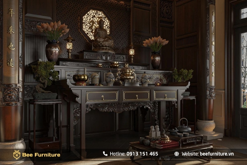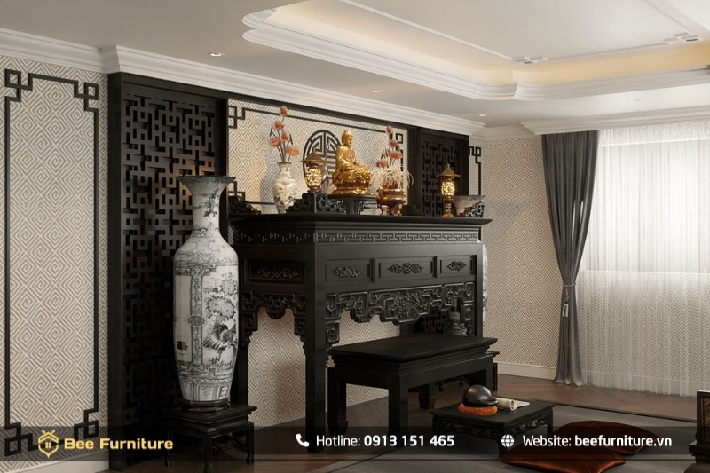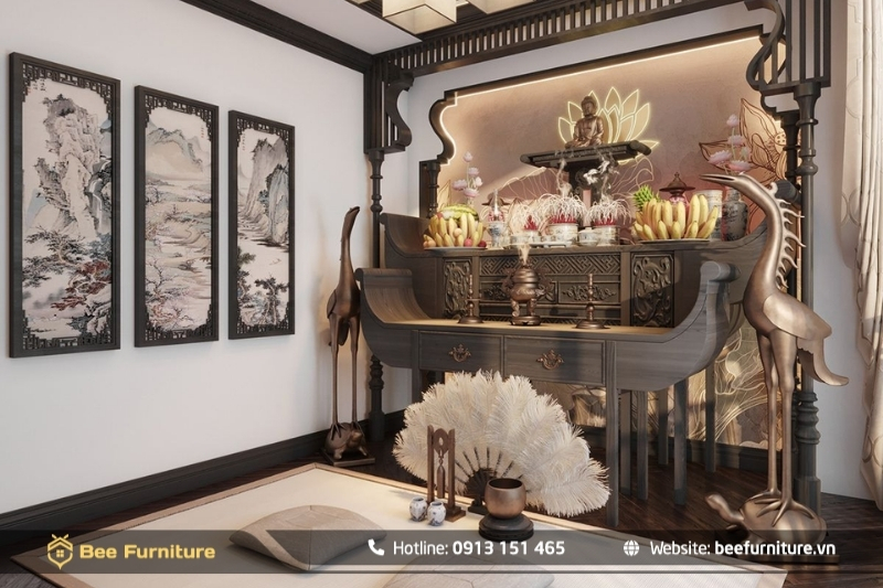 Trong văn hóa người Việt, phòng thờ là nơi thể hiện lòng thành kính với ông bà tổ tiên và các bậc thần linh, vì vậy luôn được chú trọng trong thiết kế nội thất. Thông thường, phòng thờ được bố trí ở tầng cao nhất của ngôi nhà để đảm bảo sự yên tĩnh, trang nghiêm – phù hợp cho việc thờ cúng và hương khói. Vật liệu lát sàn và ốp tường bằng gỗ là lựa chọn lý tưởng, mang lại cảm giác ấm cúng, linh thiêng và trang trọng. Về màu sắc, những gam trầm như nâu gỗ, trắng hoặc vàng nhạt thường được ưu tiên, giúp không gian thêm phần thanh tịnh, nhẹ nhàng.