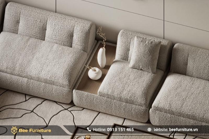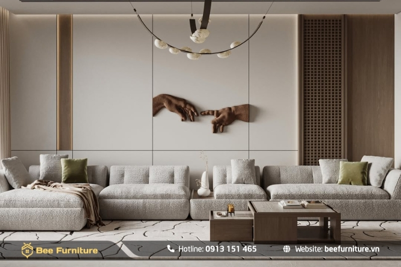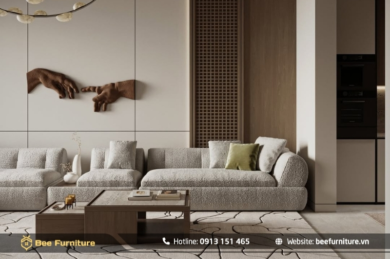 Tông màu trung tính kết hợp chất liệu vải boucle cao cấp mang lại cảm giác ấm cúng và sang trọng cho phòng khách. Bộ sofa thiết kế dạng module giúp di chuyển linh hoạt, đường nét bo tròn mềm mại, tạo sự thư giãn tối đa khi sử dụng. Thiết kế tường và sàn với họa tiết 3D làm điểm nhấn cho không gian, vừa tinh tế vừa cuốn hút ánh nhìn.