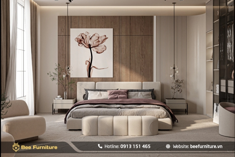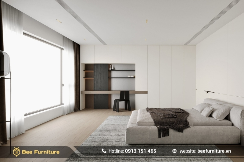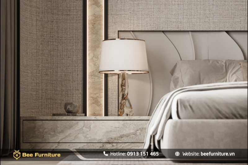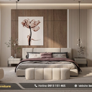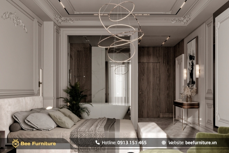 Sử dụng tone màu be – ghi làm chủ đạo, giúp không gian phòng ngủ trở nên nhẹ nhàng, tinh tế. Tủ đầu giường, đèn ngủ và các chi tiết décor theo phong cách Luxury sang trọng. Hệ thống anh sáng dịu nhẹ giúp tăng chiều sâu và tạo cảm giác thư giãn tự nhiên cho cả căn phòng..