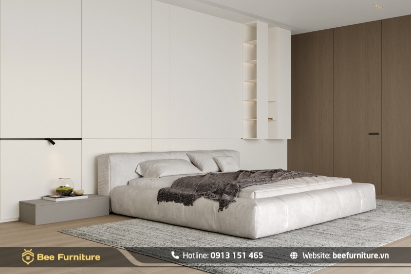 Thiết kế tối giản không cầu kỳ trong đường nét, không gian tập trung vào công năng và sự thoải mái. Tường sơn màu be, giường gỗ thấp cùng tone màu với tường kết hợp cùng tủ quần áo màu gỗ tạo nên sự cân bằng thị giác. Ánh sáng tự nhiên được thiết kế vừa đủ, mang lại cảm giác thư giãn cho giấc ngủ.