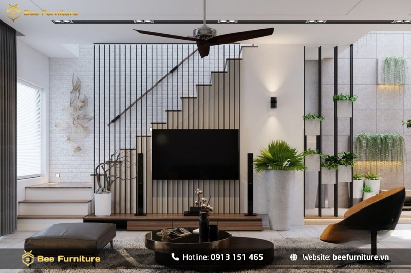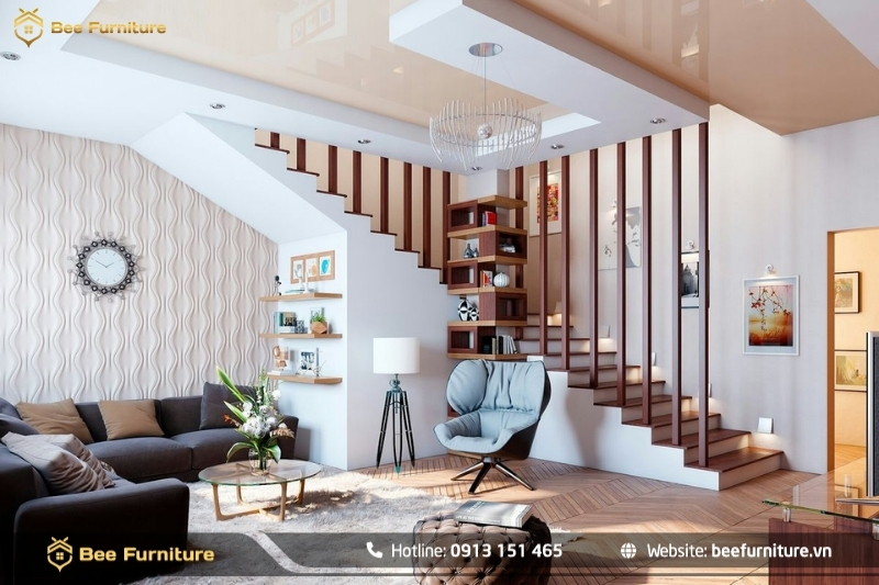 Trong thiết kế nhà phố hoặc nhà ống, khu vực cầu thang không chỉ đóng vai trò giao thông mà còn có thể tận dụng làm điểm nhấn thẩm mỹ cho phòng khách. Một số giải pháp thiết kế cho cầu thang như: Phối màu nổi bật hoặc sử dụng các vật liệu trang trí như gạch ốp nghệ thuật, lam gỗ, kính… sẽ giúp khu vực này trở nên sinh động, đồng thời tăng giá trị tổng thể cho thiết kế nội thất.